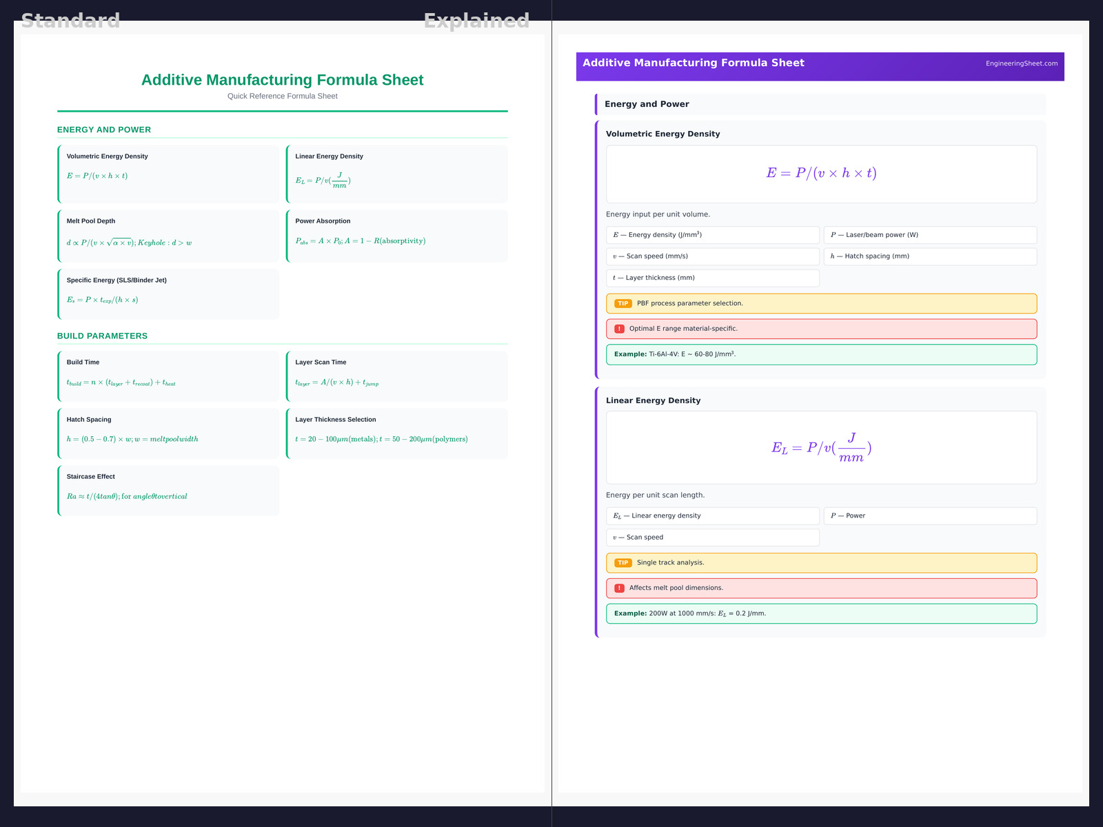 Master additive manufacturing with this detailed formula sheet covering process physics, energy density, build parameters, material properties, design guidelines, and quality control for AM engineers and designers.