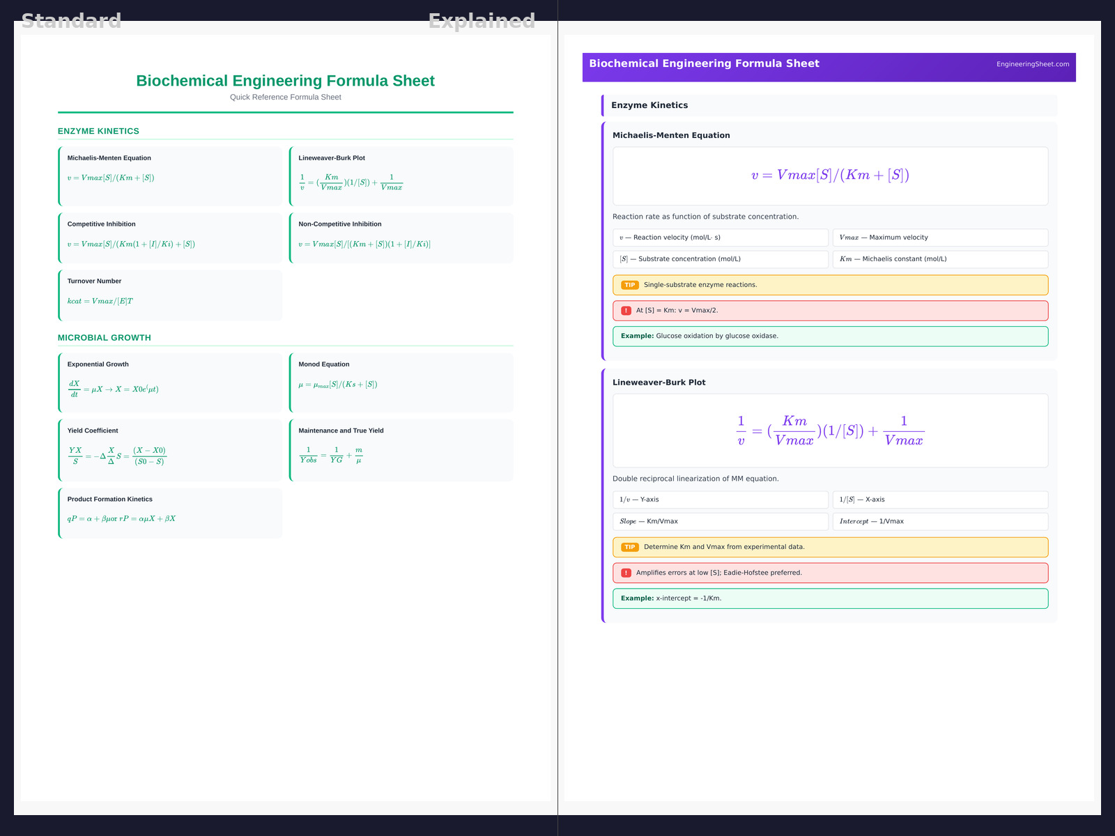 Master biochemical engineering with this detailed formula sheet covering enzyme kinetics, microbial growth, bioreactor design, oxygen transfer, sterilization, and downstream processing for biopharmaceuticals and industrial biotechnology.