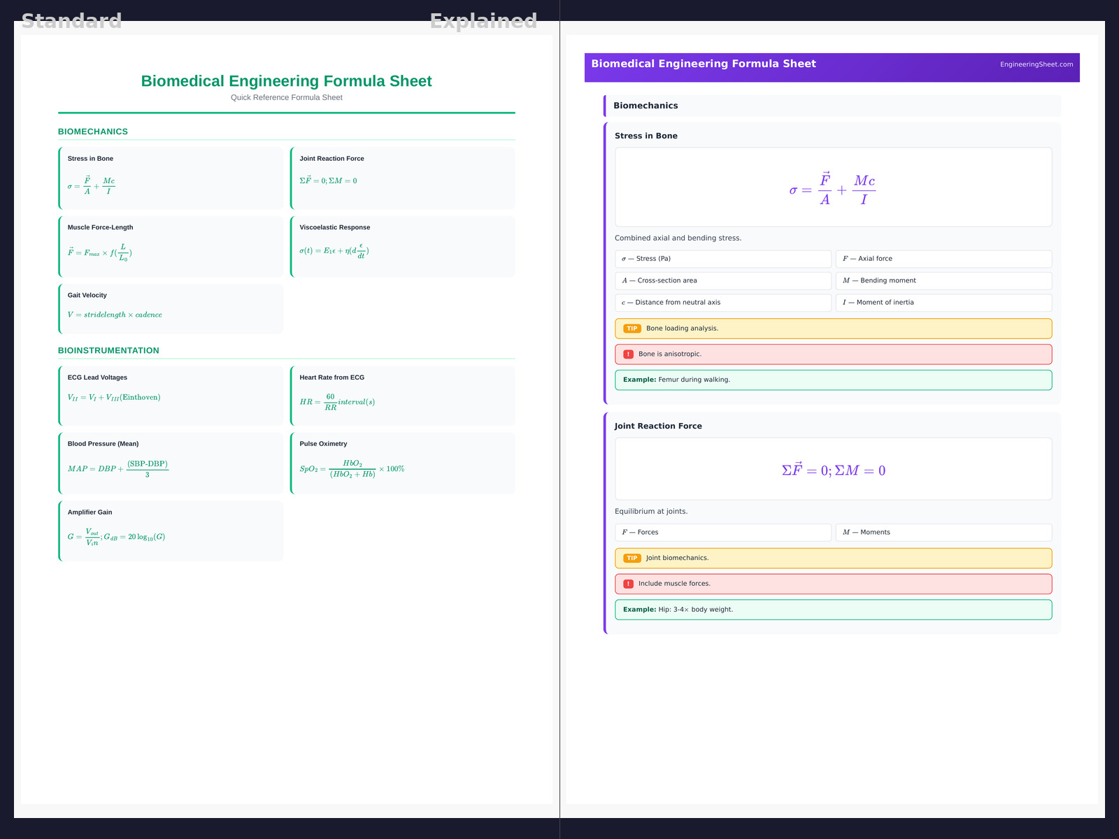 Master biomedical engineering with formulas covering biomechanics, bioinstrumentation, biomaterials, medical imaging, and physiological systems.