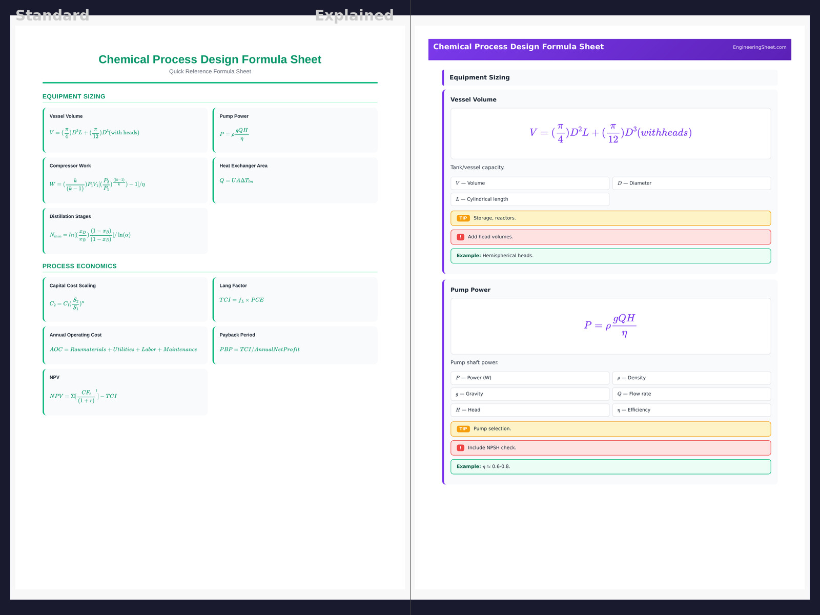 Master chemical process design with formulas for equipment sizing, economics, safety, and process optimization.