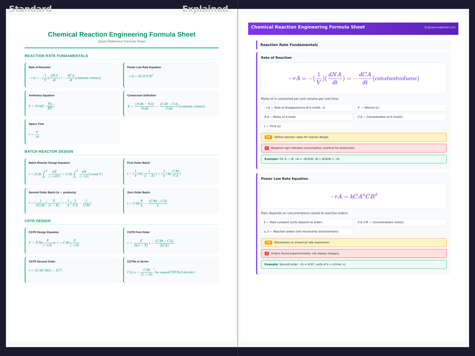 Master chemical reaction engineering with this detailed formula sheet covering reaction kinetics, rate laws, reactor design equations, conversion calculations, selectivity, residence time, and non-ideal reactor analysis.