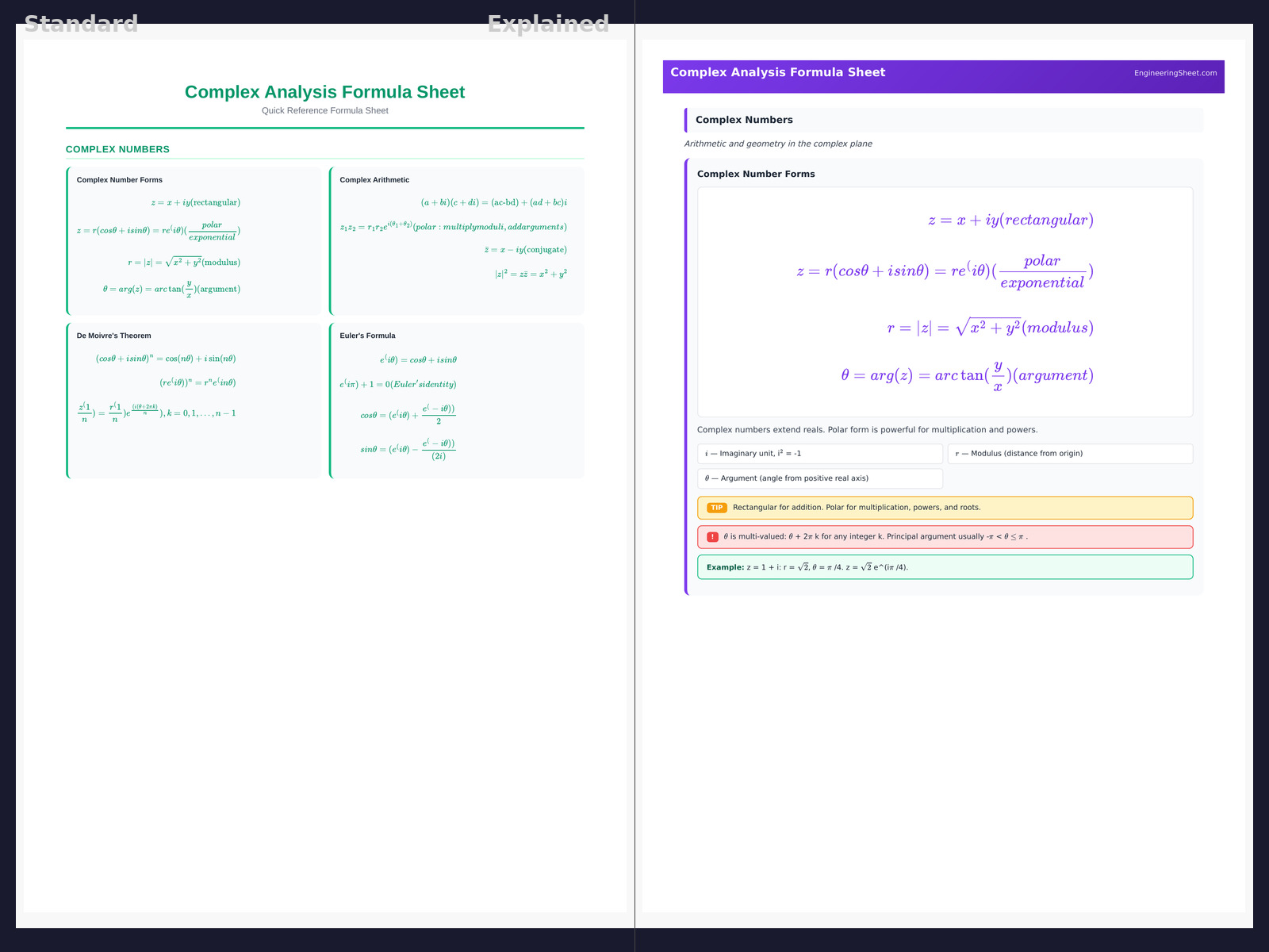 5 pages | 35 formulas | Topics: Complex Numbers, Analytic Functions, Contour Integration, Residue Theory, Conformal Mapping, Series | Course codes: MATH 4320, MATH 185, COMPLEX, MATH 3100