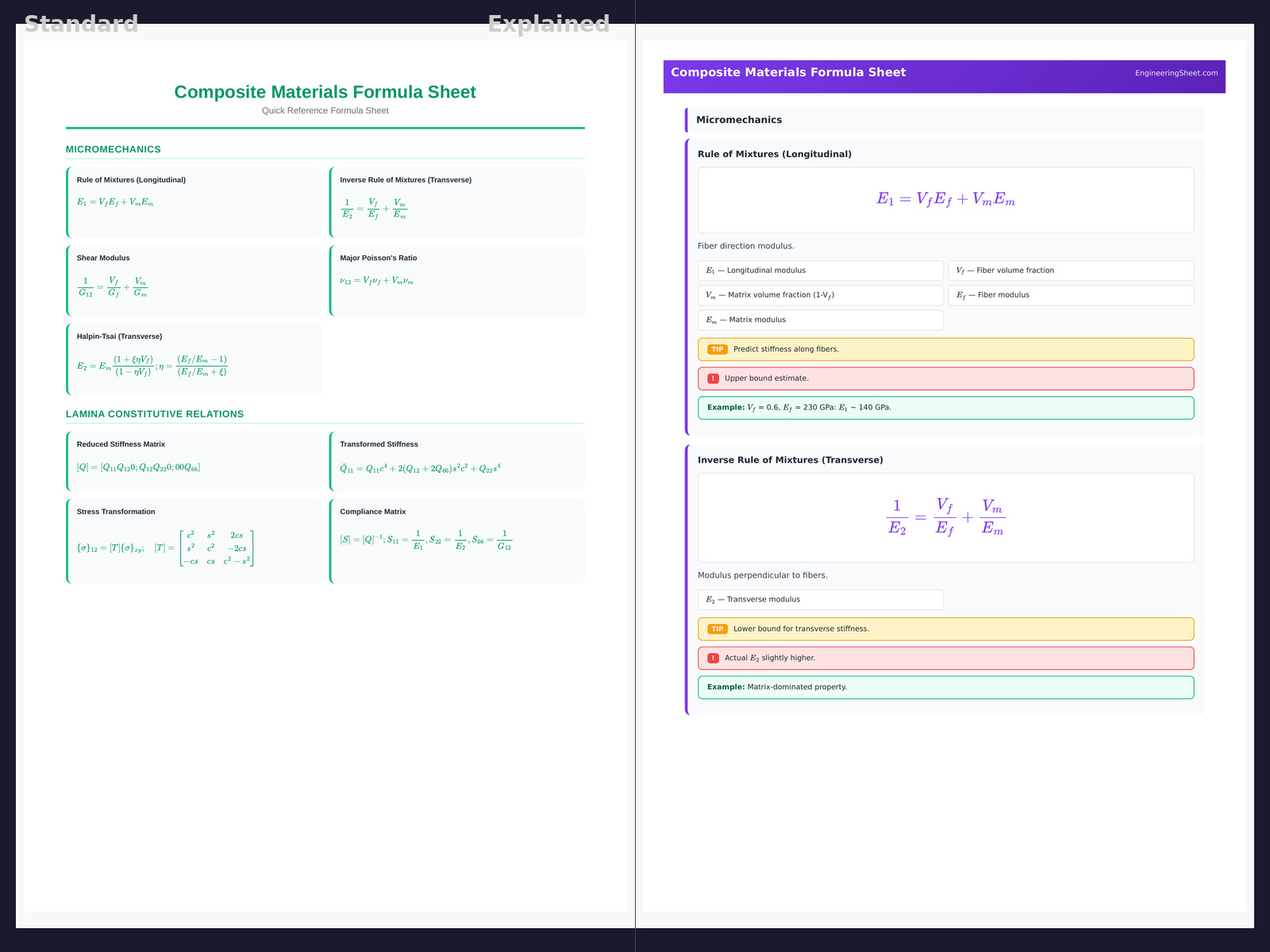 Master composite materials with this detailed formula sheet covering laminate theory, micromechanics, failure criteria, ply stacking, hygrothermal effects, and design methods for aerospace and structural engineers.