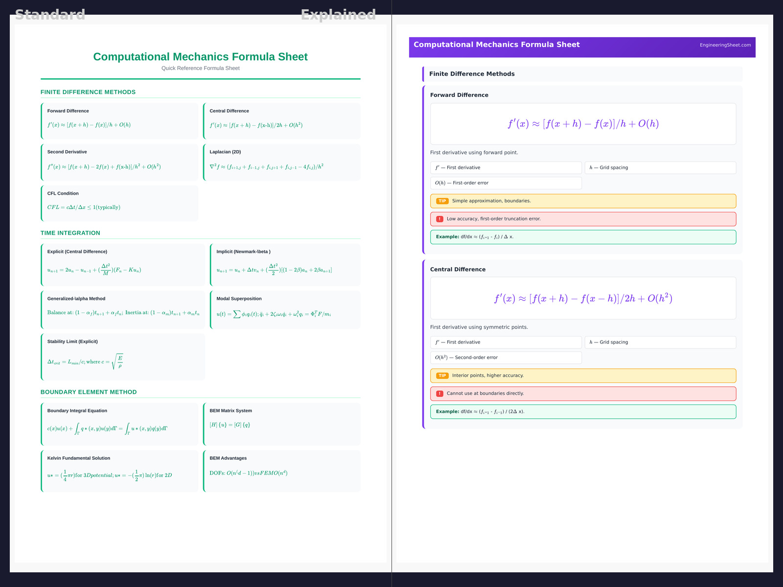 Master computational mechanics with this detailed formula sheet covering finite differences, boundary element methods, meshless methods, explicit/implicit time integration, coupled analysis, and verification and validation for advanced simulation.