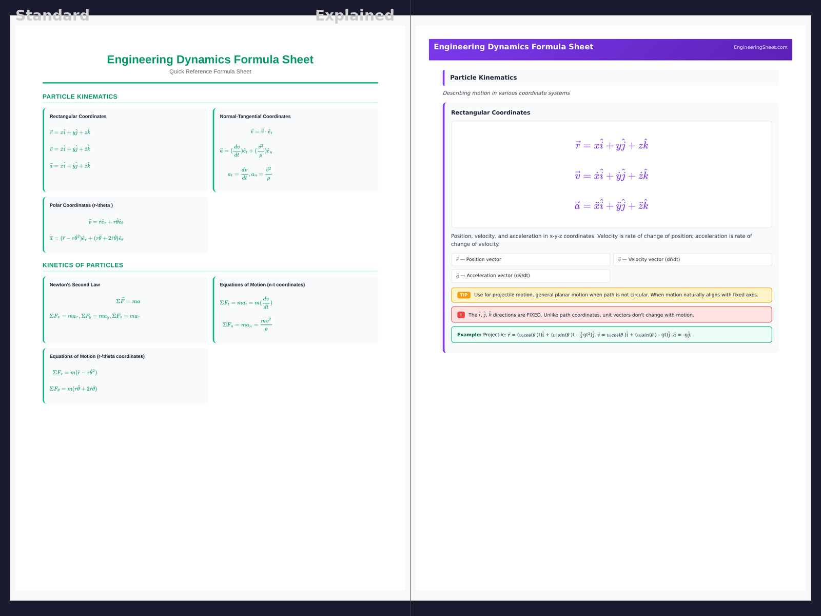 5 pages | 36 formulas | Topics: Particle Kinematics, Kinetics, Work-Energy, Impulse-Momentum, Rigid Body Motion, Vibrations | Course codes: ME 2120, ENGR 2030, CE 2120, DYNAMICS