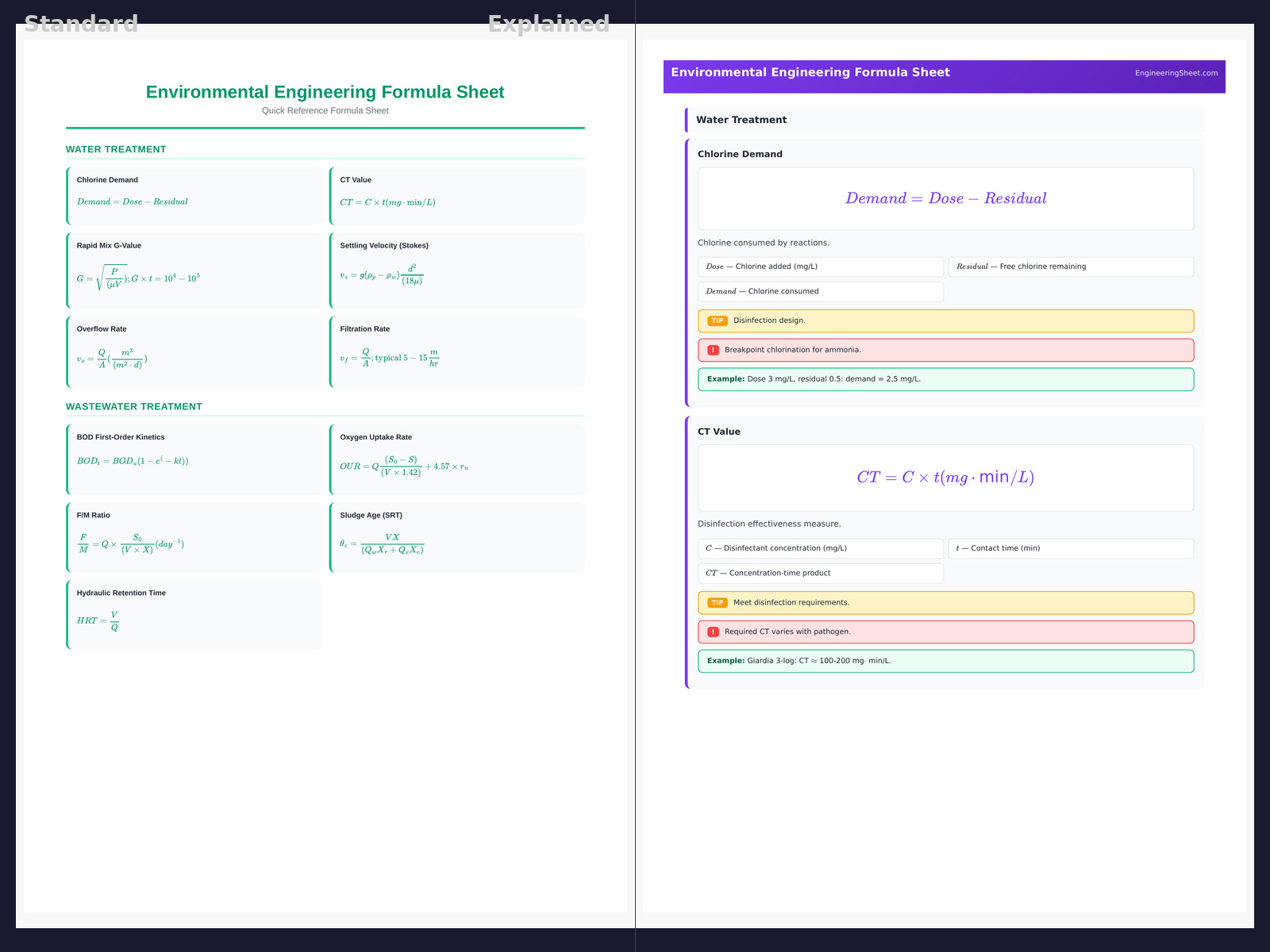 Master environmental engineering with this detailed formula sheet covering water treatment, wastewater processes, air pollution control, solid waste management, and environmental remediation for environmental engineers.