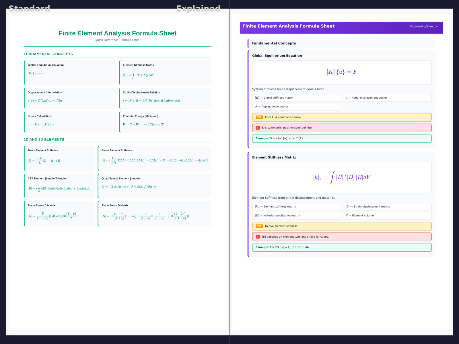 Master finite element analysis with this detailed formula sheet covering element formulations, shape functions, stiffness matrices, convergence criteria, meshing guidelines, and solution techniques for structural and thermal analysis.