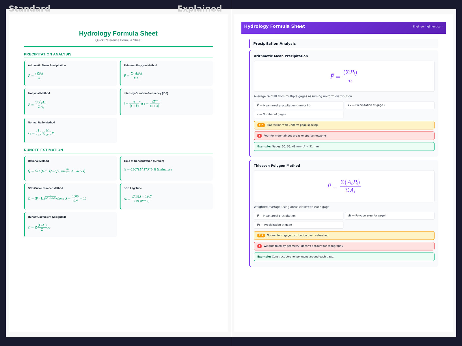Master engineering hydrology with this detailed formula sheet covering precipitation analysis, runoff estimation, hydrograph analysis, groundwater flow, flood frequency, reservoir routing, evapotranspiration, and watershed modeling methods.