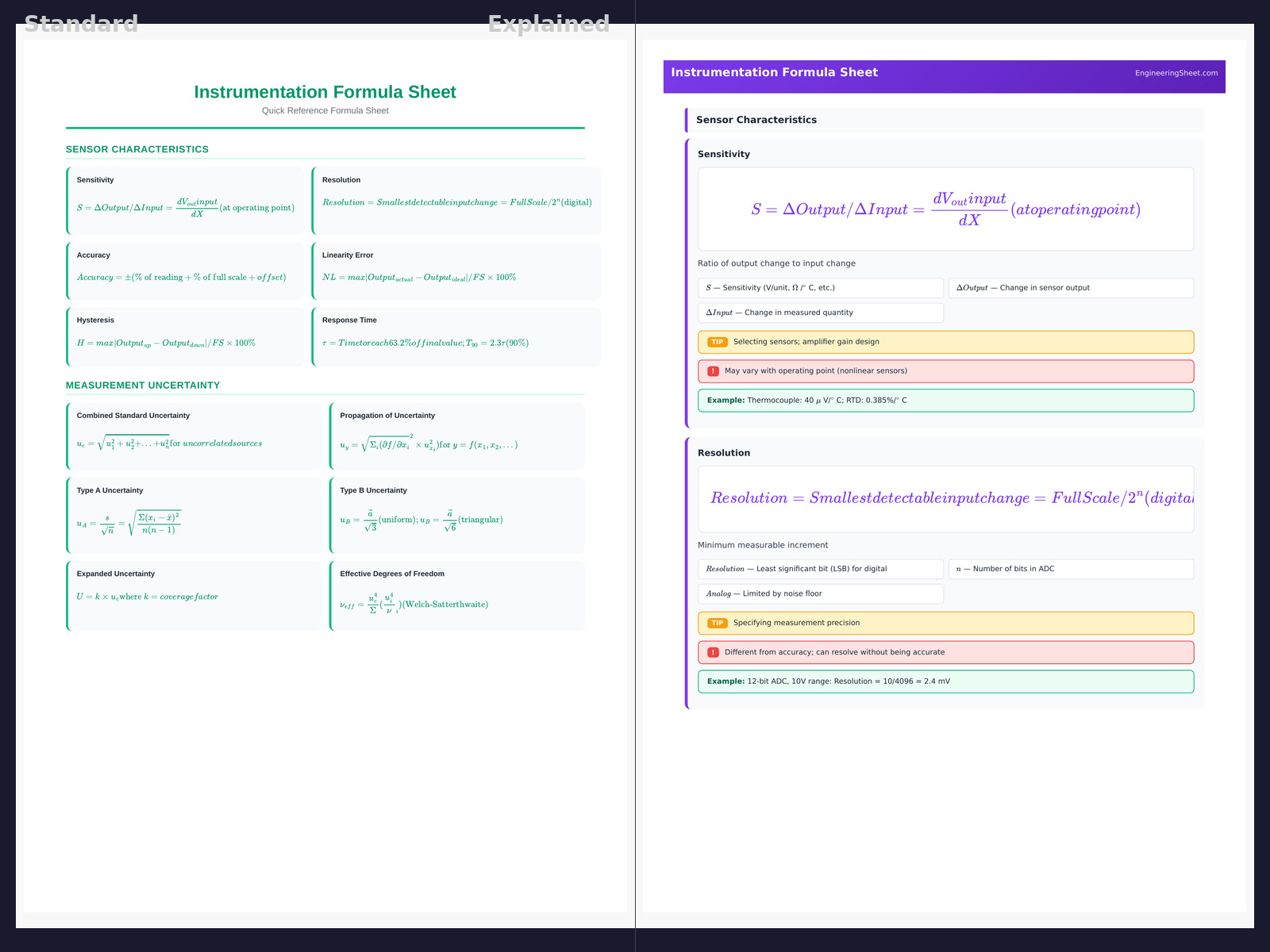 5 pages | 32 formulas | Topics: Sensors, Uncertainty, Signal Conditioning, Data Acquisition, Calibration | Course codes: ECE 445, ME 365, EE 432, ECEN 4638, EECE 5200