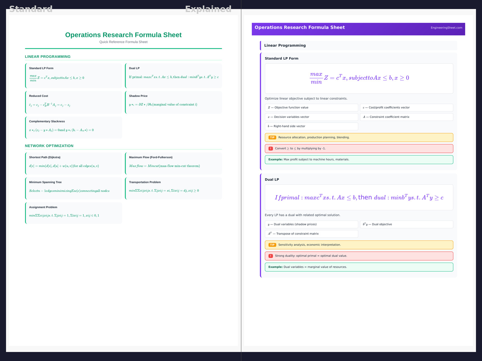 Master operations research with this detailed formula sheet covering linear programming, network optimization, queuing theory, inventory models, decision analysis, simulation, and game theory for engineering management.