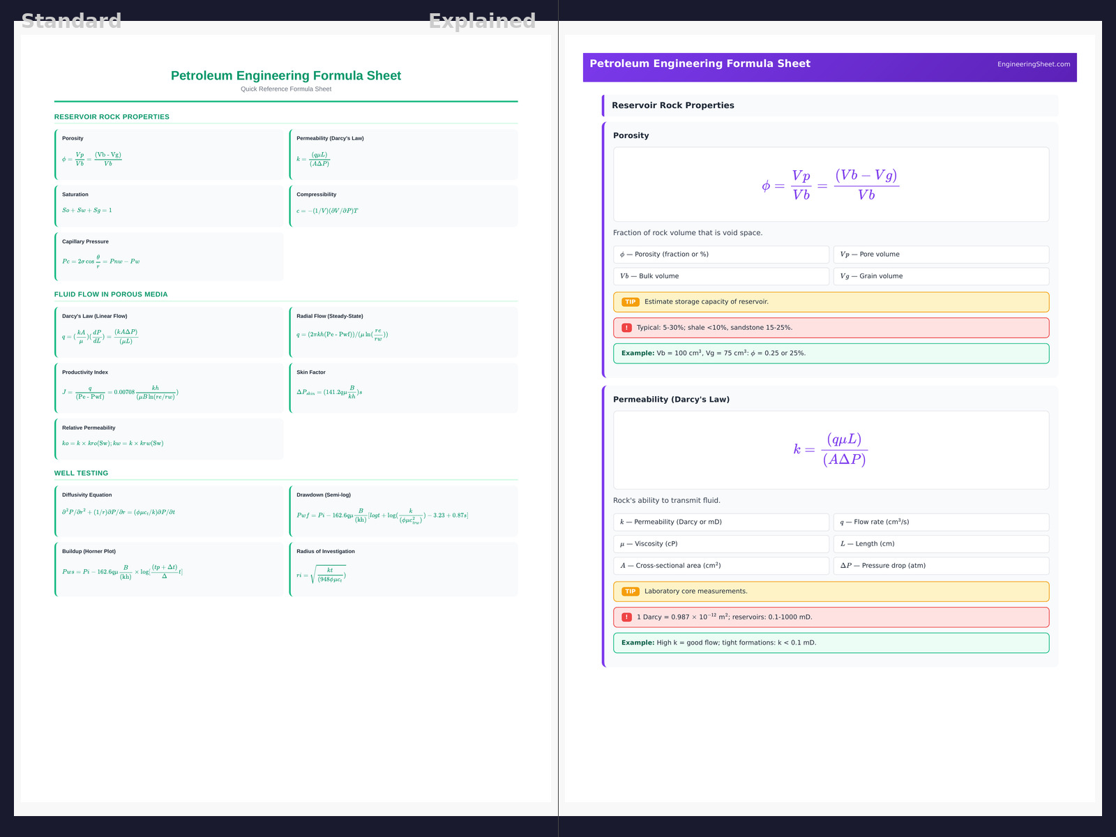 Master petroleum engineering with this detailed formula sheet covering reservoir properties, fluid flow in porous media, well testing, production optimization, drilling calculations, and enhanced oil recovery methods.