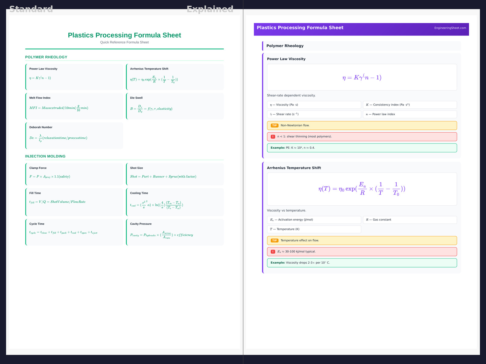 Master plastics processing with this detailed formula sheet covering injection molding, extrusion, blow molding, thermoforming, and polymer rheology for plastics engineers and manufacturing specialists.