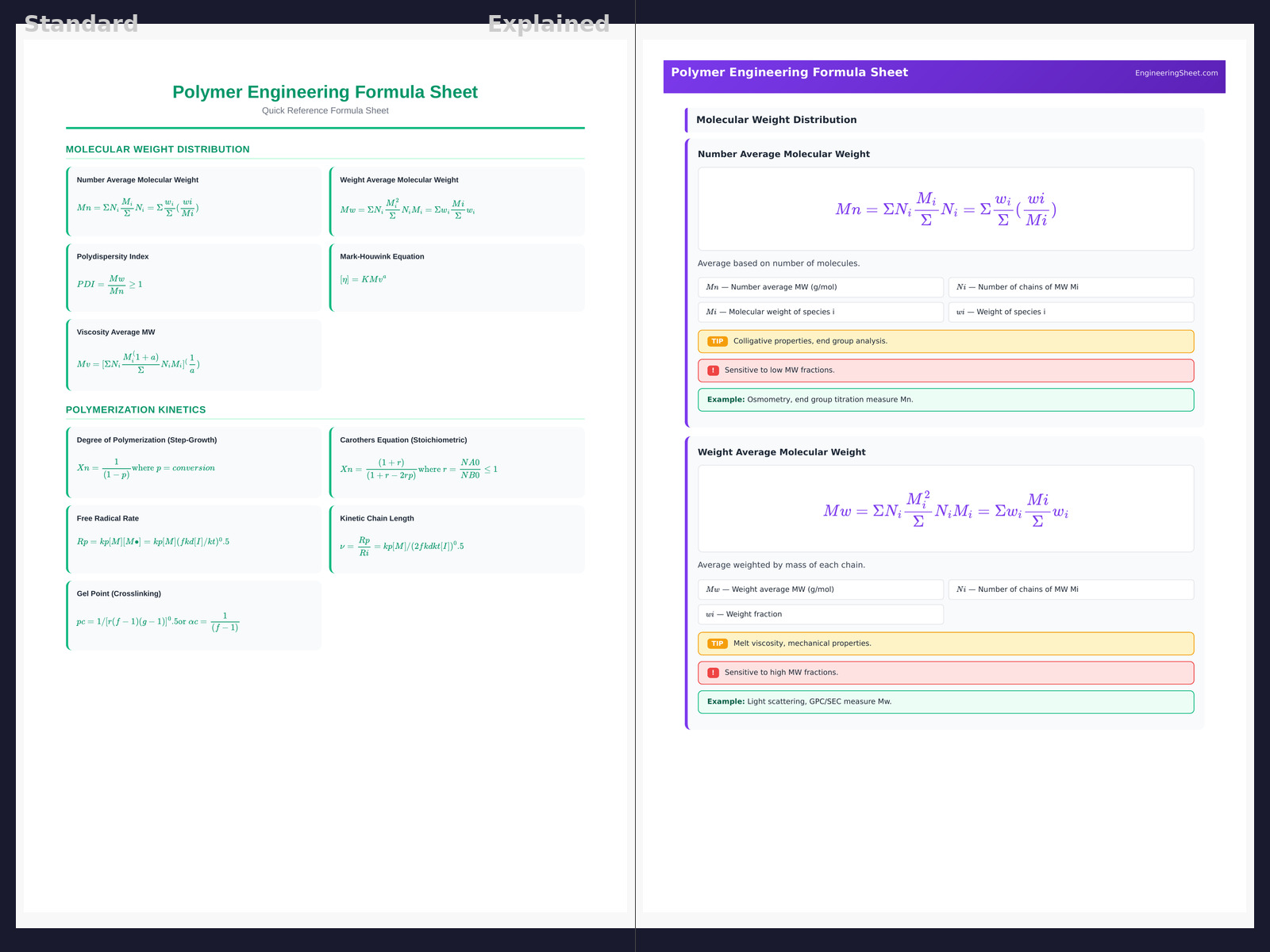 Master polymer engineering with this detailed formula sheet covering molecular weight distributions, polymer rheology, reaction kinetics, mechanical properties, processing equations, and structure-property relationships.