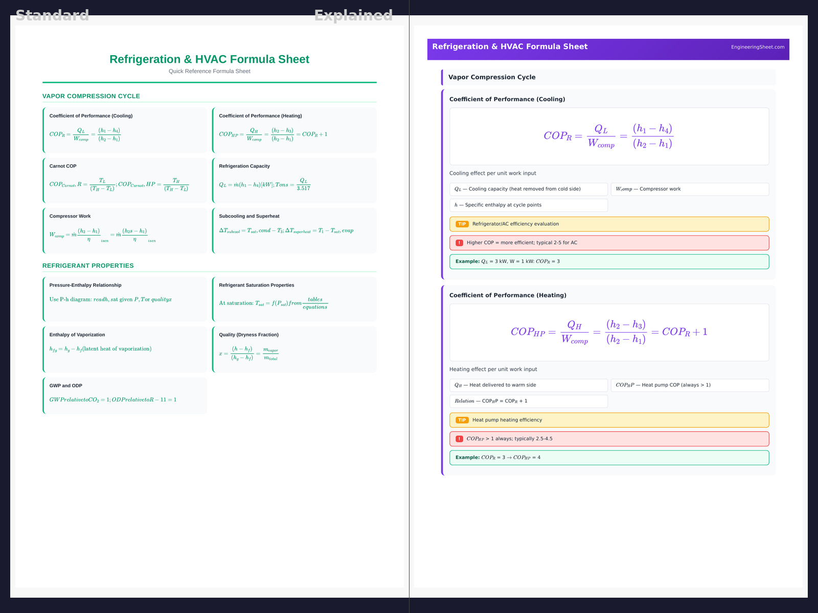 5 pages | 35 formulas | Topics: Vapor Compression, Psychrometrics, Heat Pumps, Cooling Load, Refrigerants | Course codes: ME 412, MAE 4273, MECE 4342, ME 380, AE 6373