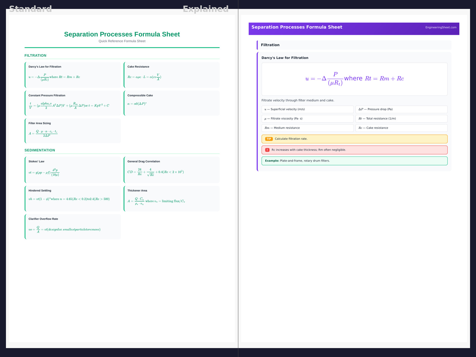 Master separation processes with this detailed formula sheet covering filtration, sedimentation, centrifugation, drying, crystallization, adsorption, ion exchange, and chromatography with equipment design equations.