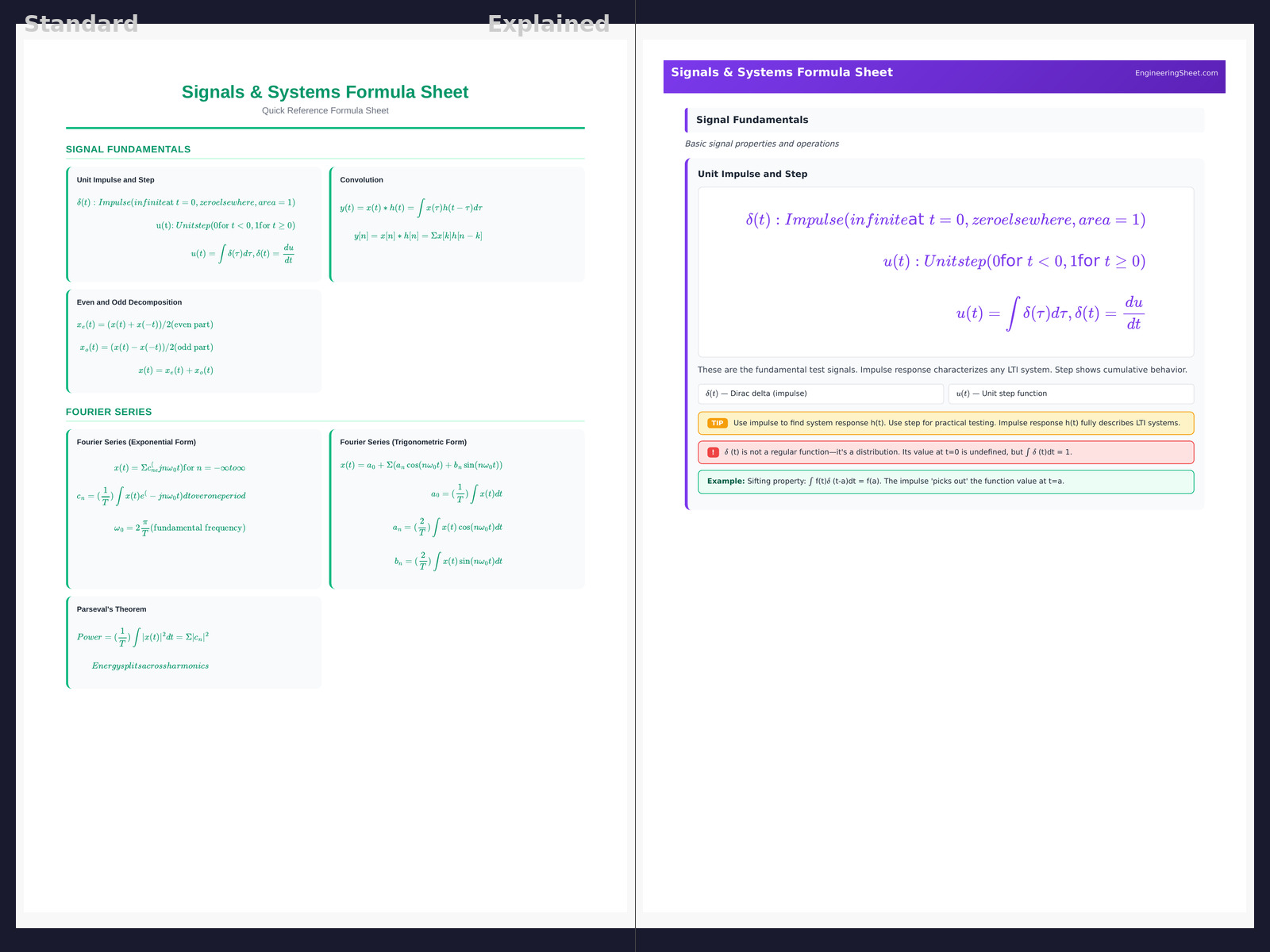 5 pages | 35 formulas | Topics: Convolution, Fourier Series, Fourier Transform, Laplace Transform, Z-Transform, Sampling, Filters | Course codes: ECE 2026, EE 224, SIGNALS, ECE 301