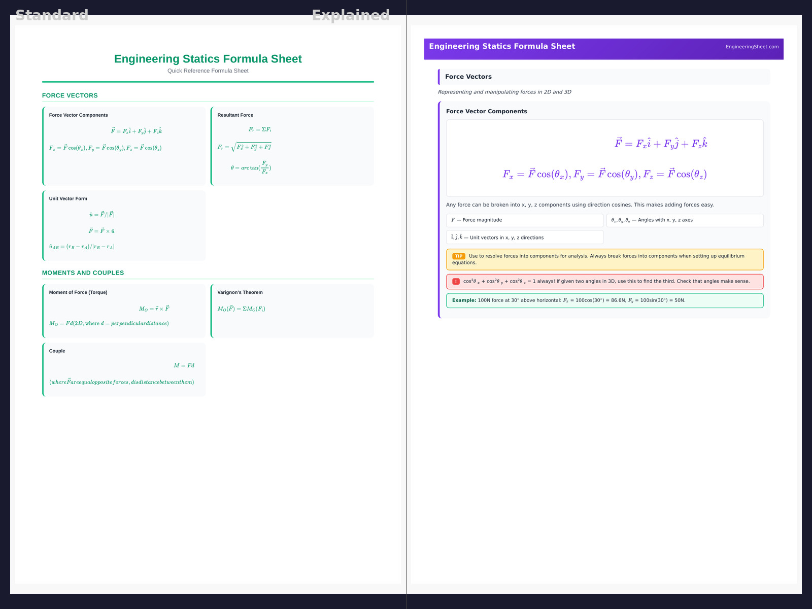 5 pages | 35 formulas | Topics: Force Vectors, Equilibrium, Structures, Centroids, Moments of Inertia, Friction | Course codes: CE 2010, ME 2010, ENGR 211, STATICS