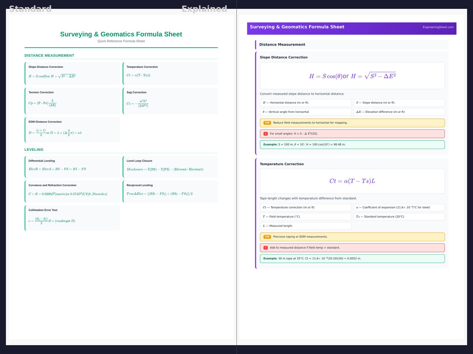 Master surveying and geomatics with this detailed formula sheet covering distance measurement, leveling, traverse calculations, coordinate geometry, curve layout, GPS positioning, error analysis, and earthwork volumes.