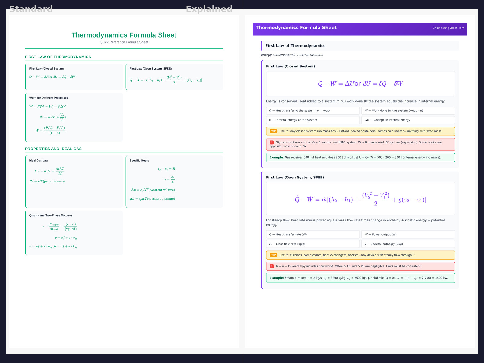 5 pages | 38 formulas | Topics: First Law, Second Law, Properties, Cycles, Entropy, Exergy | Course codes: ME 3322, CHE 3310, THERMO, ME 201