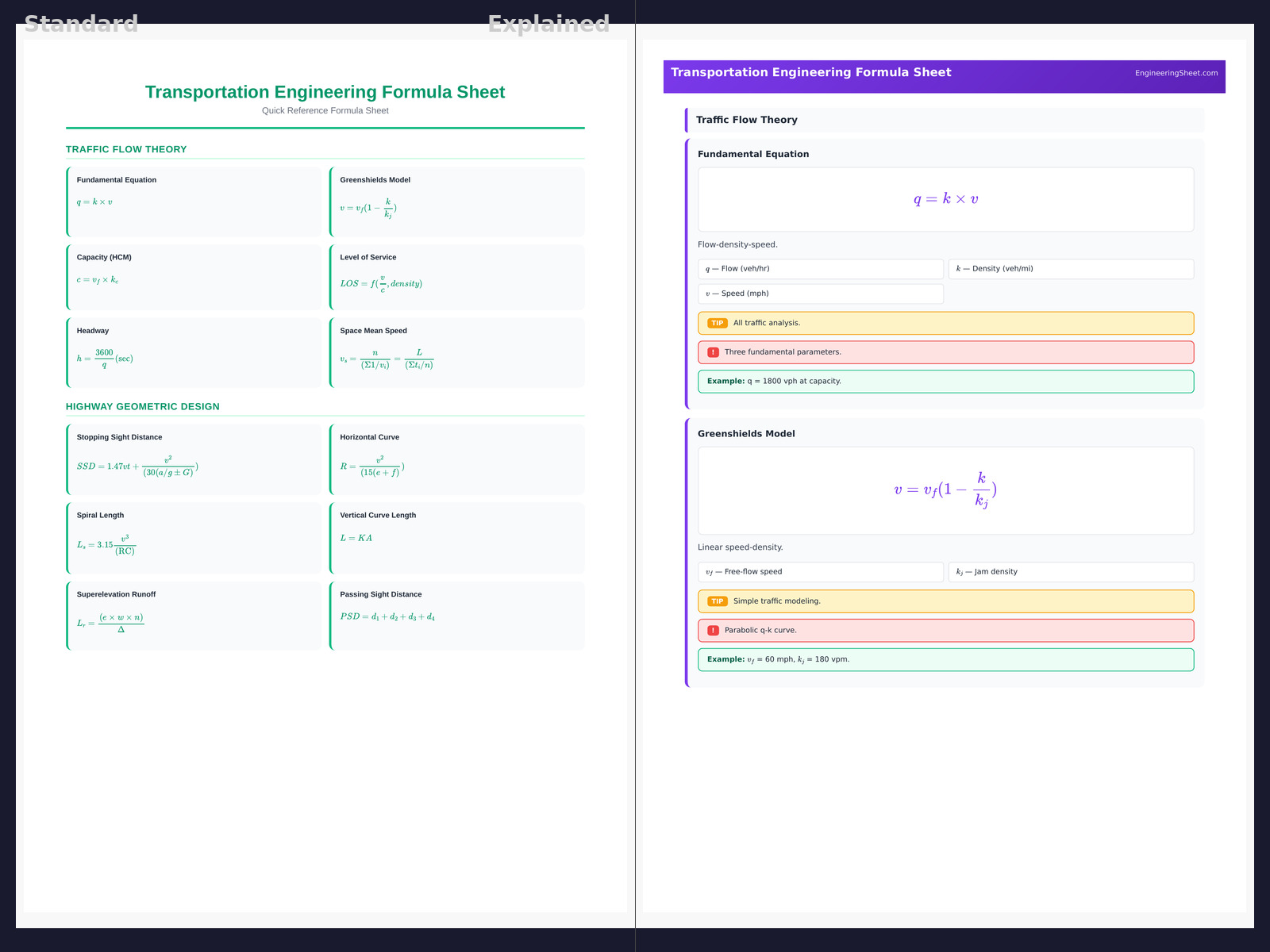 Master transportation engineering with formulas covering traffic flow, highway design, pavement, intersection design, and transit.