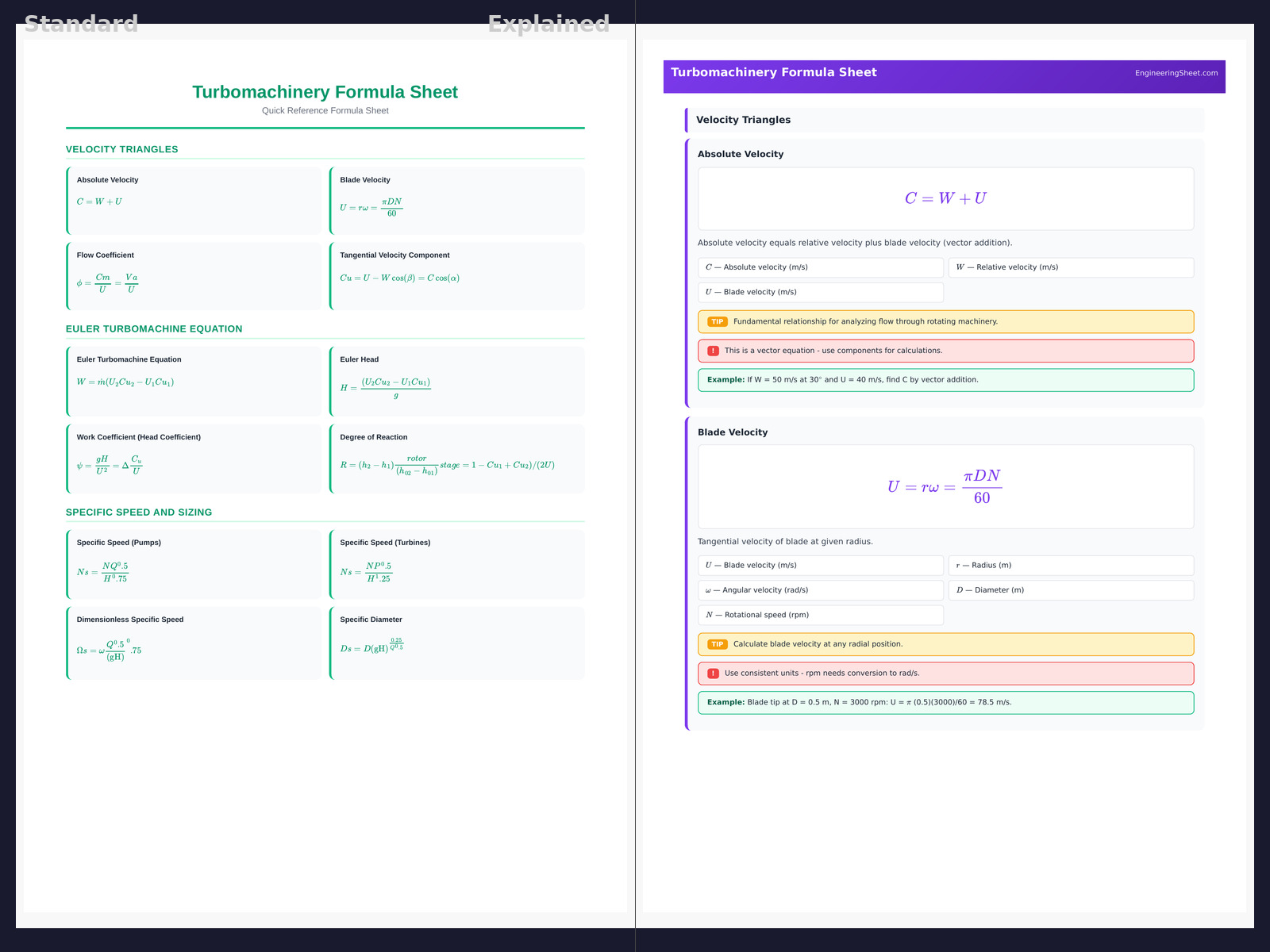 Master turbomachinery with this detailed formula sheet covering velocity triangles, Euler turbomachine equation, specific speed, cavitation analysis, pump affinity laws, turbine efficiency, compressor performance maps, and cascade aerodynamics.
