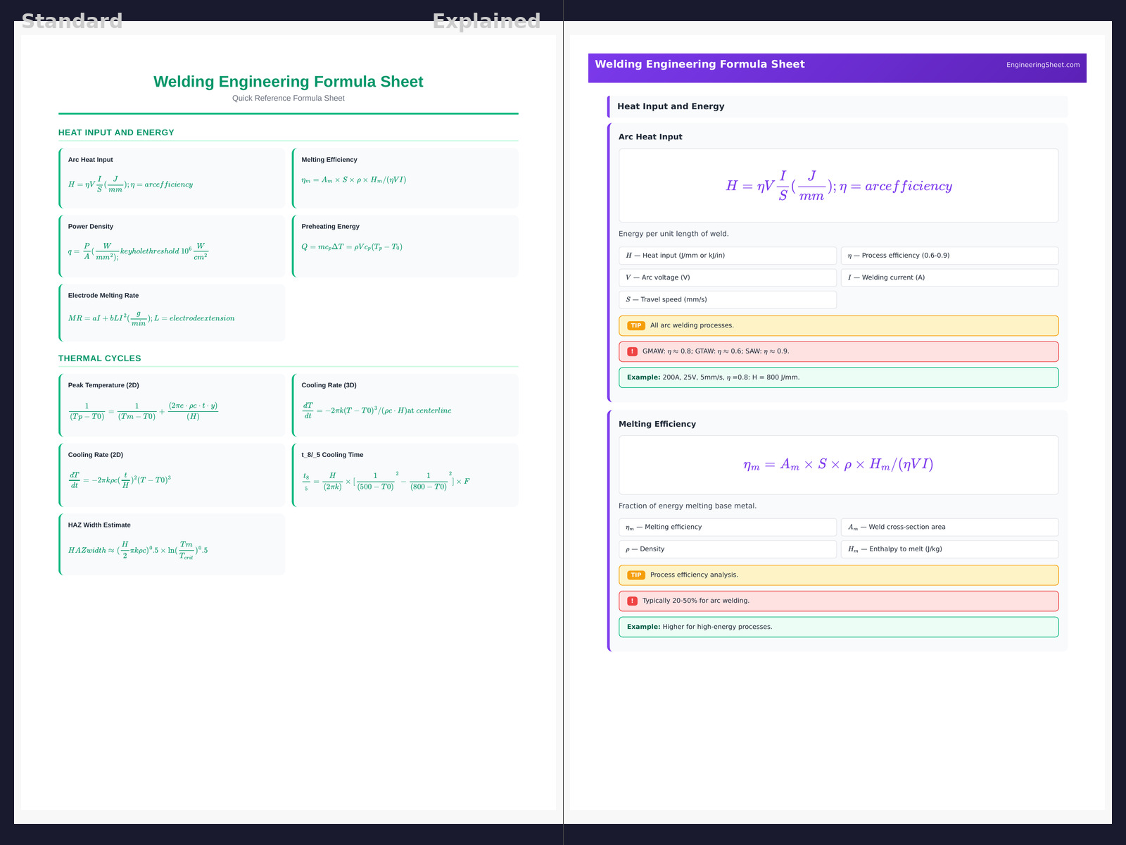 Master welding engineering with this detailed formula sheet covering heat input, thermal cycles, weld metallurgy, residual stress, weld design, and quality control for welding engineers and fabricators.